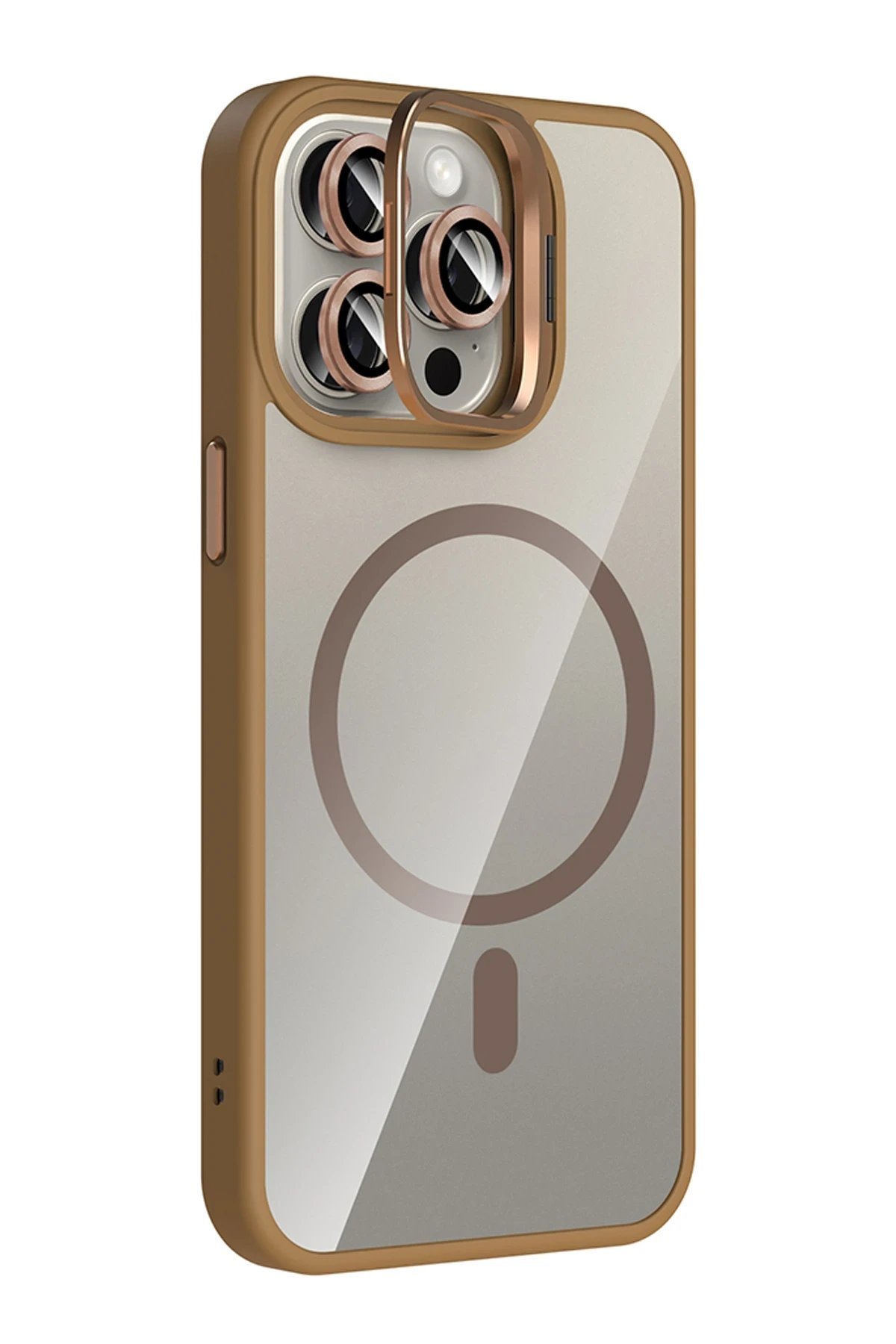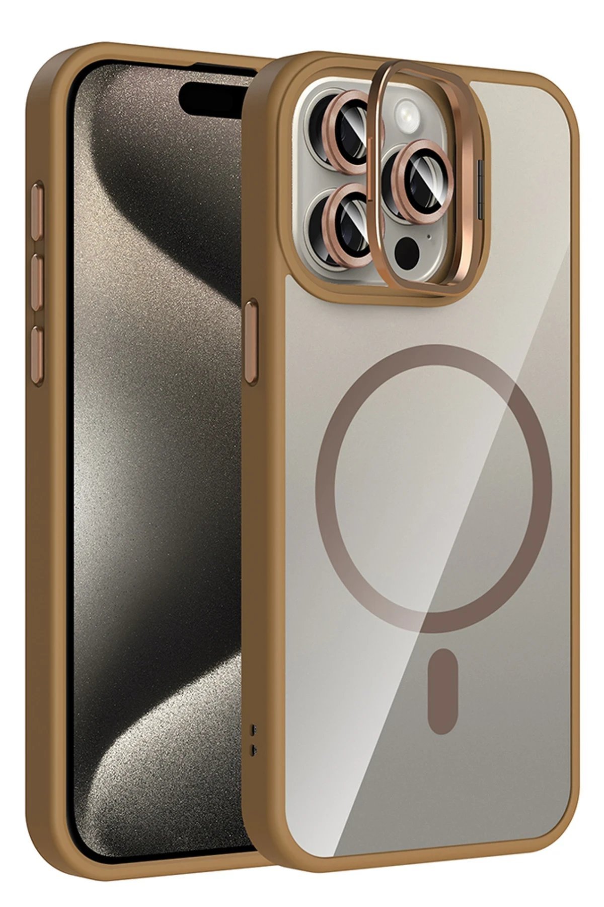 Apple iPhone 14 Pro Max Remim Lensli Magsafe Standlı Kapak – Kahverengi-(5796)
