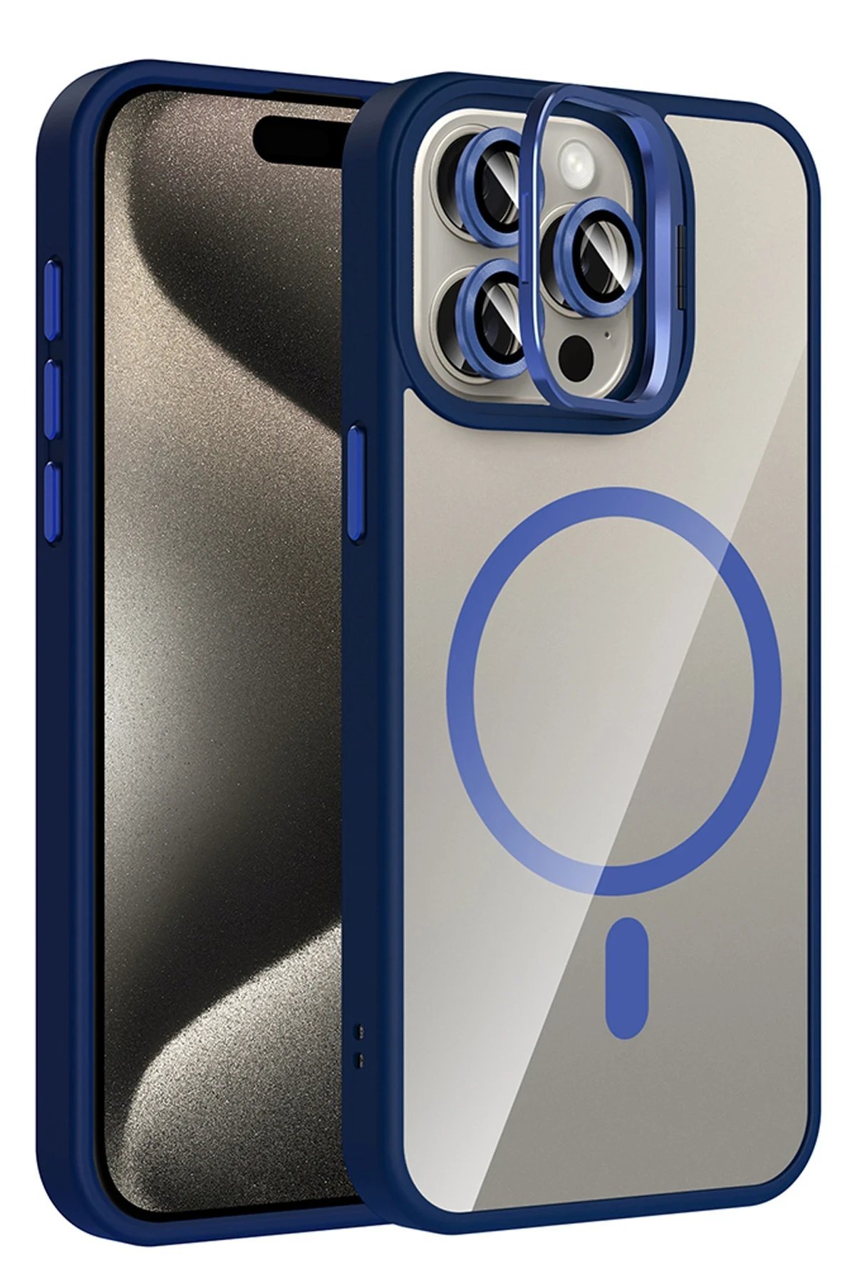 Apple iPhone 14 Pro Max Remim Lensli Magsafe Standlı Kapak – Lacivert-(5796)