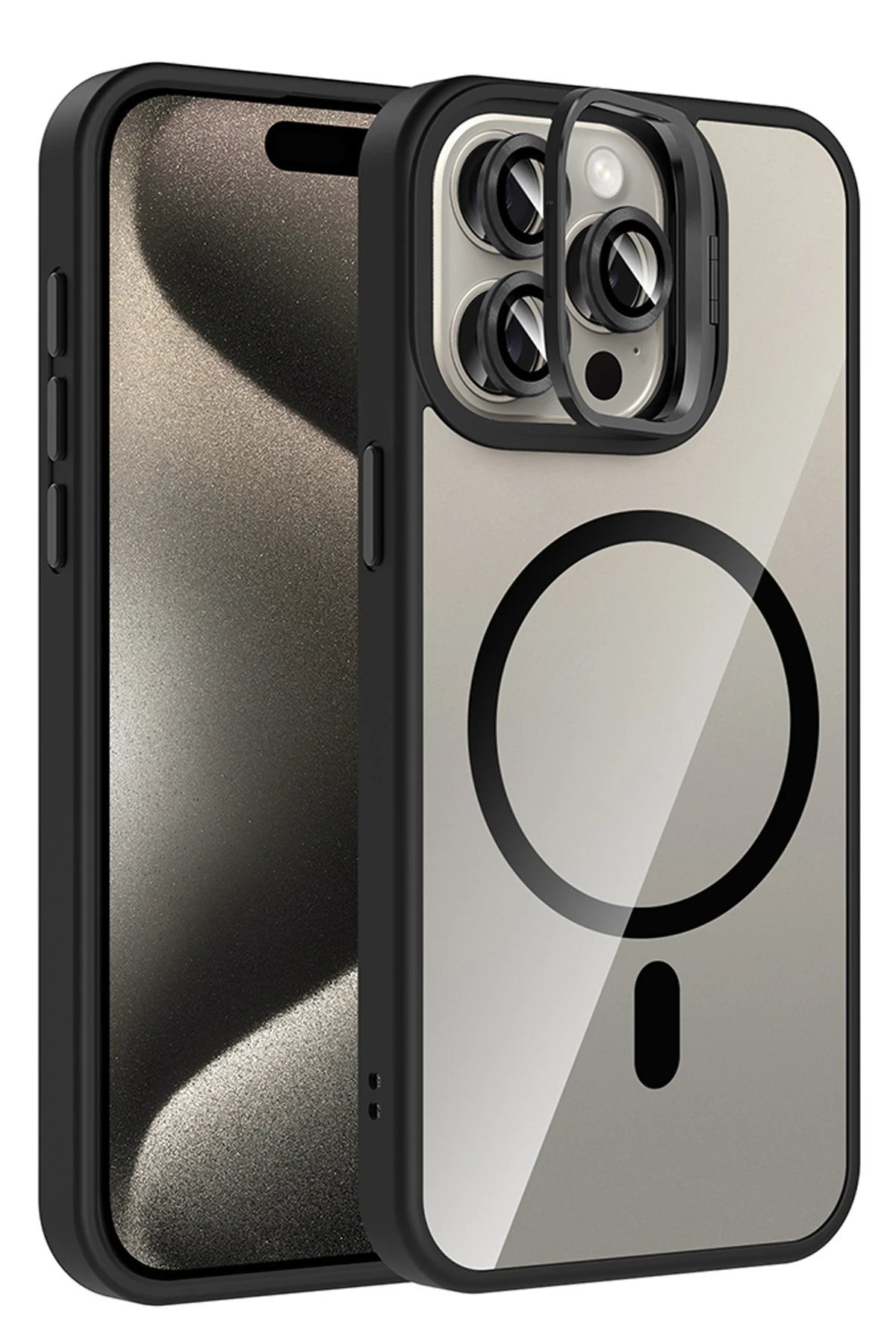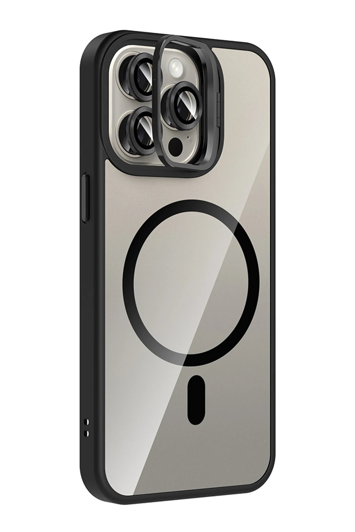 Apple iPhone 14 Pro Max Remim Lensli Magsafe Standlı Kapak – Siyah-(5796)
