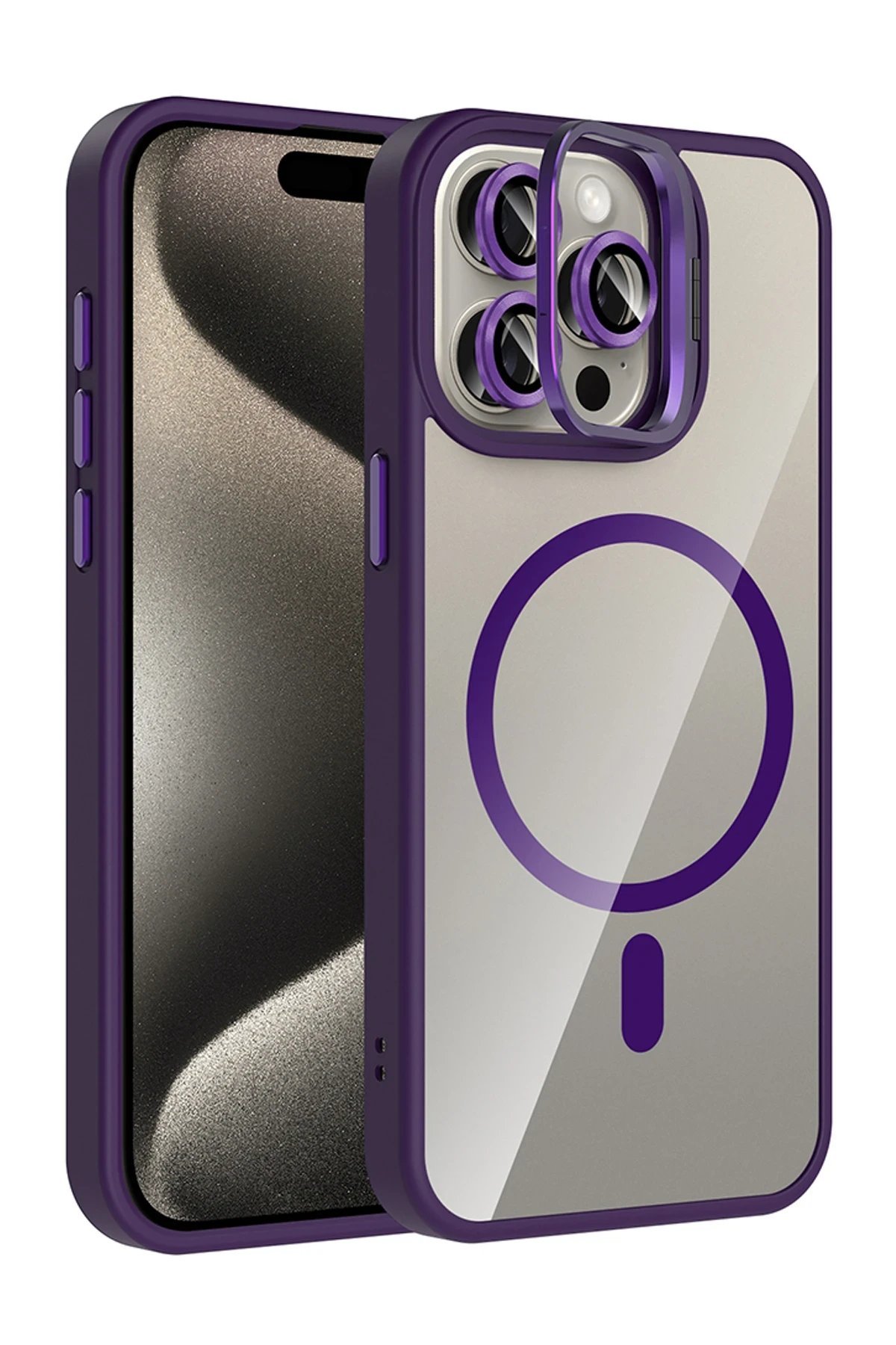 Apple iPhone 15 Pro Max Remim Lensli Magsafe Standlı Kapak - Derin Mor-(5796)