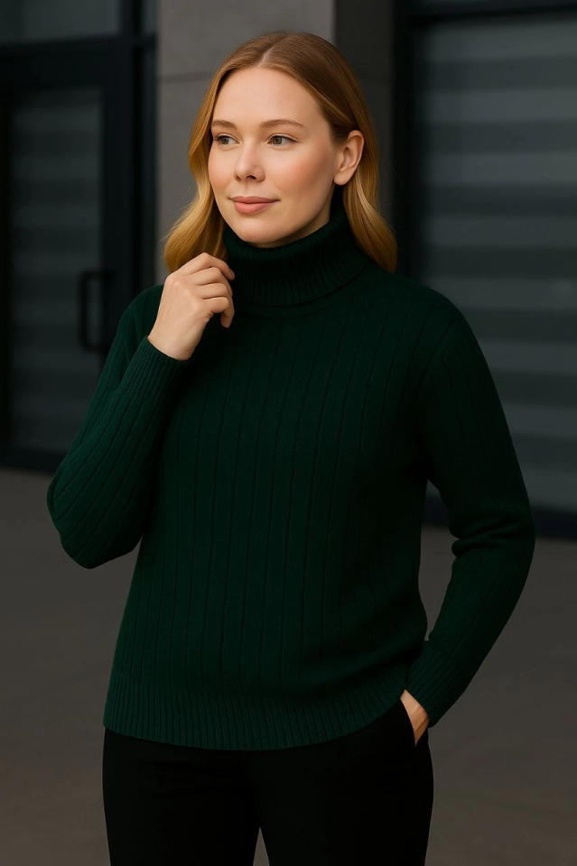 Balıkcı Yaka Bağazlı Triko Kazak Pamuklu Kalın Fitilli Dokuma – Haki