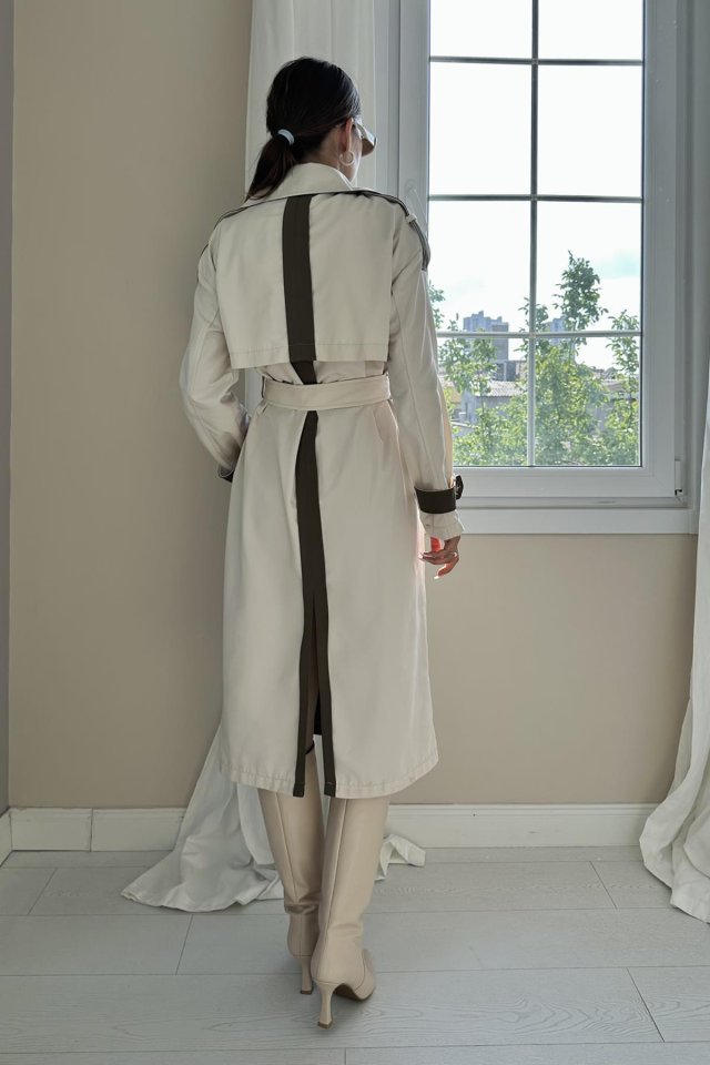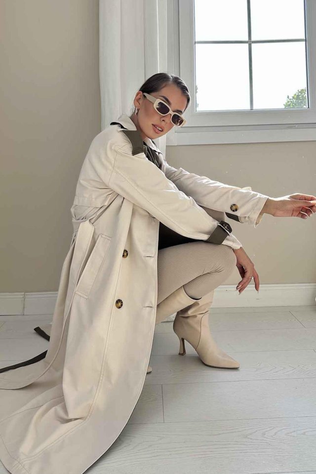 Bej Haki Arkası Çizgili Ve Kemerli Trençkot