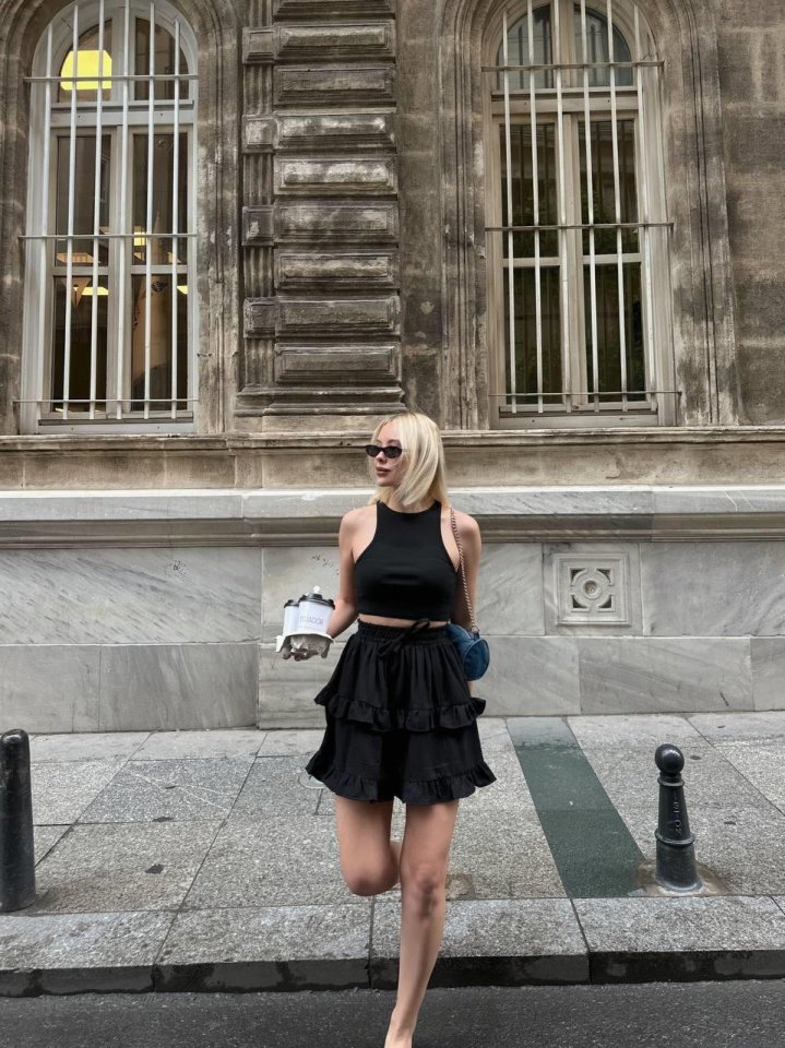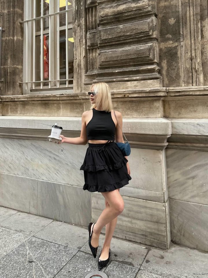 BEL LASTİKLİ KAT FIRFIR DETAYLI KISA ETEK – Siyah