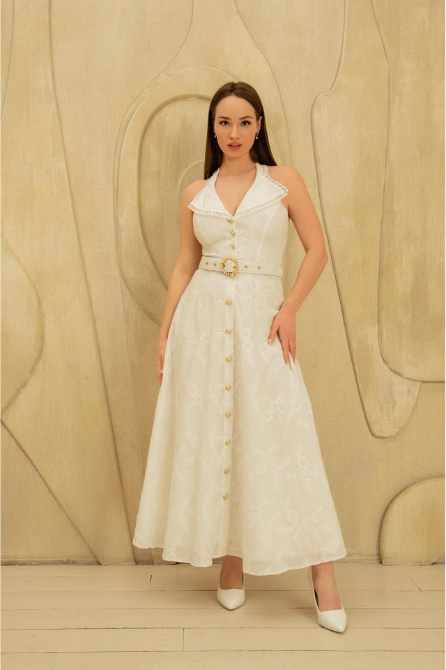 Beyaz İnci Kemer Detaylı Dantelli Elbise