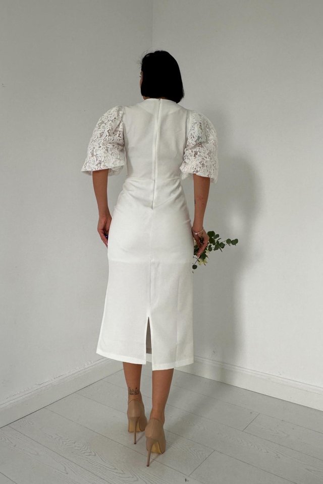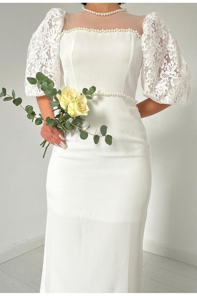 Beyaz İncili Tül Detay Elbise