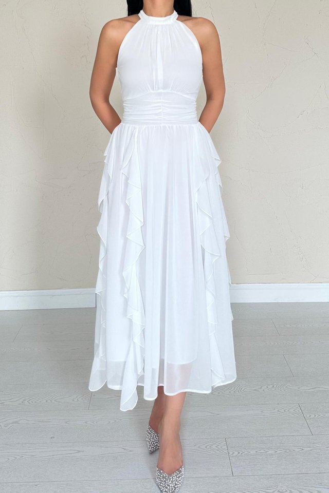 Beyaz Önü Büzgülü Fırfırlı Elbise
