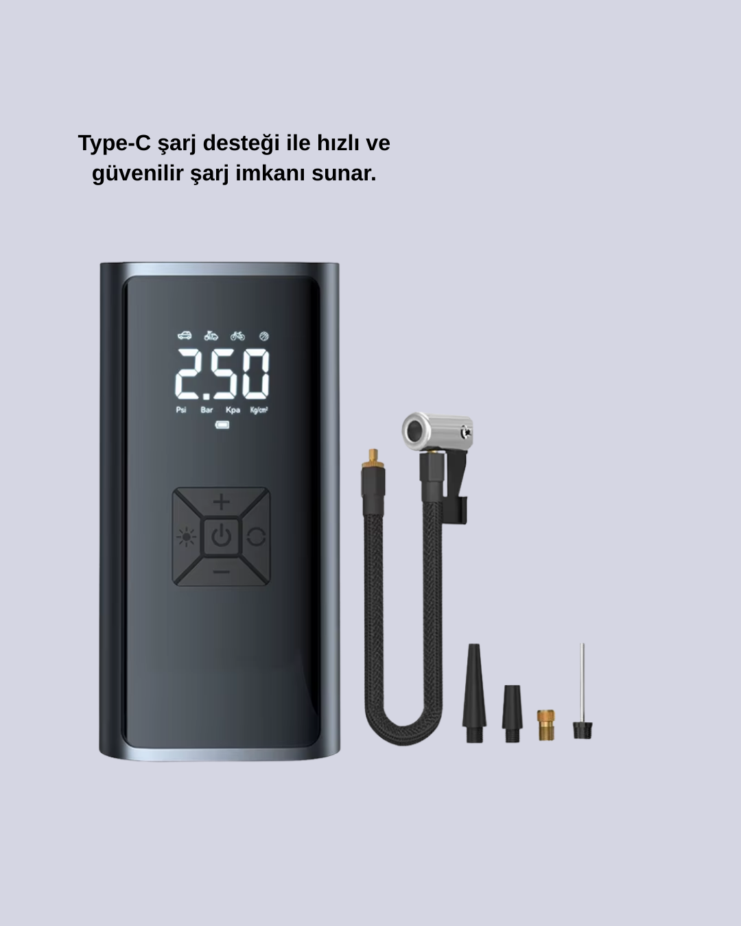 Dijital yükseltilmiş sürümüyle öne çıkan bu taşınabilir lastik pompası, güçlü performansı ve çok işlevliliği bir arada sunar. 80W motoru ile lastikleri hızlıca şişirir. Arabalar, elektrikli araçlar, bisikletler ve toplar için farklı modları mevcuttur.Kablosuz şişirme teknolojisi sayesinde ekstra kabloya gerek duymazsınız. Kompakt boyutu ile kolay taşınabilir, aracınızda yer kaplamaz. Dört katmanlı güçlendirilmiş tasarımı sayesinde sağlam ve uzun ömürlüdür.Dijital ekranı, basınç değerlerini net şekilde görmenizi sağlar. Önceden basınç ayarı yaparak güvenli kullanım elde edebilirsiniz. LED lamba fonksiyonu gece kullanımında kolaylık sağlarken, SOS ışıkları acil durumlarda hayat kurtarıcı olabilir.Spor toplarından şişme yataklara kadar geniş bir kullanım alanına sahip bu cihaz, tek bir ürünle birçok ihtiyacınızı karşılar. Güçlü motoru, dayanıklı yapısı ve pratik tasarımıyla günlük yaşamda vazgeçilmez bir yardımcınızdır.