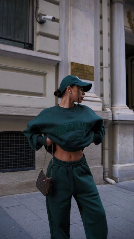 Bisiklet Yaka Nakış İşlemeli Üç İplik Sweat Takım – Yeşil