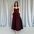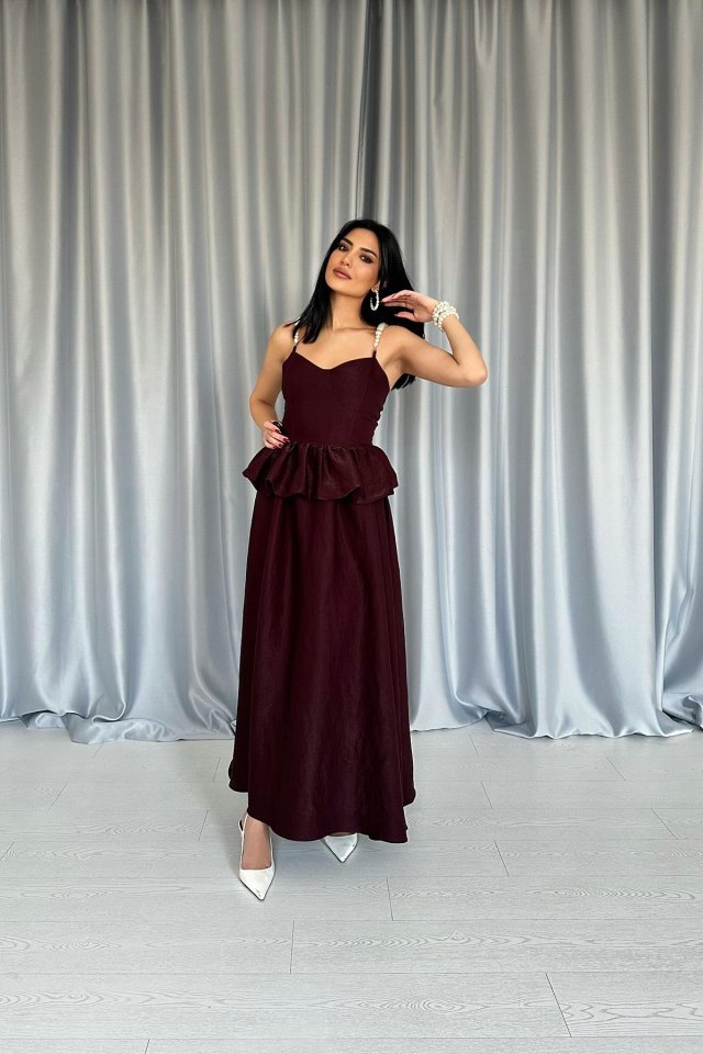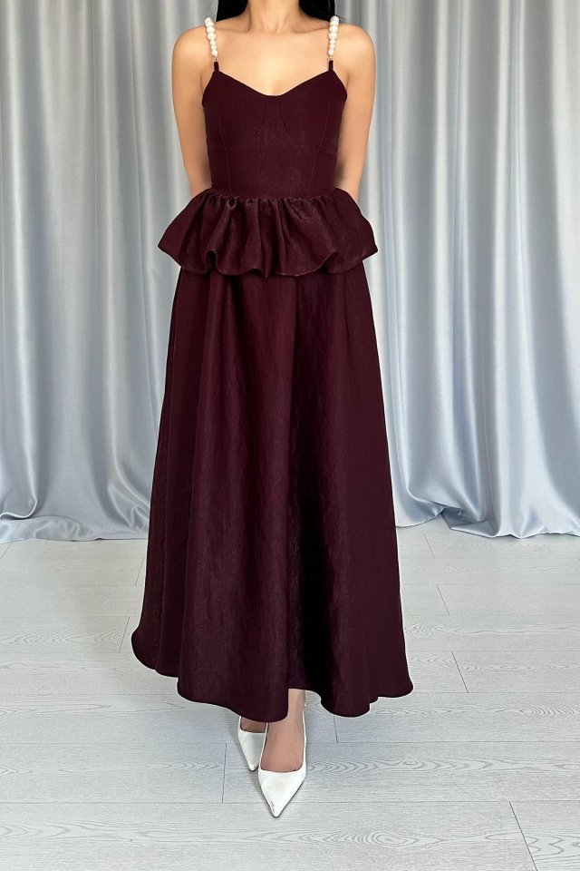 Bordo Beli Büzgülü İnci Askılı Uzun Elbise