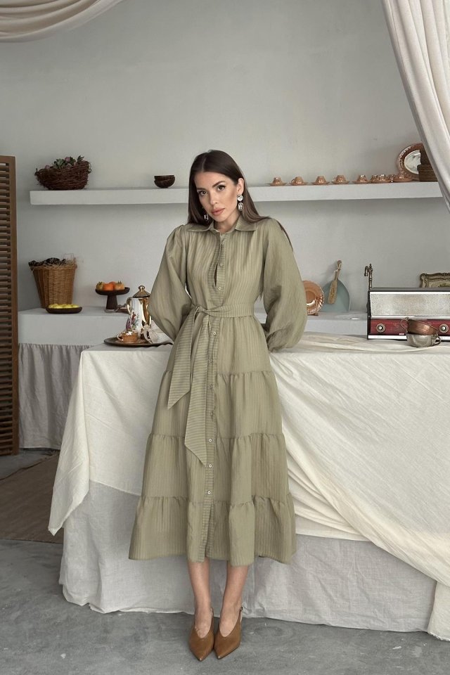 Çağla Çizgi Desenli Uzun Elbise