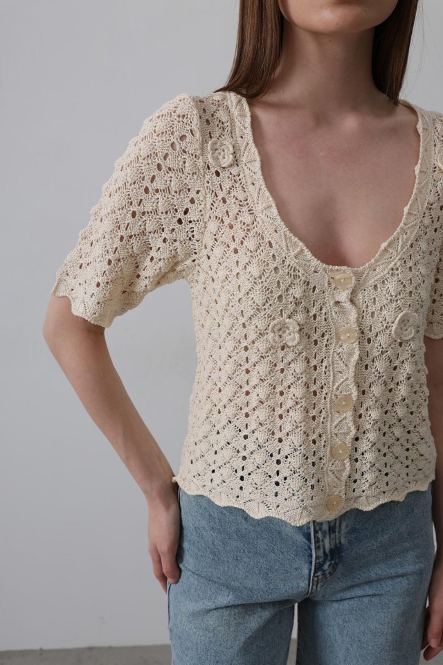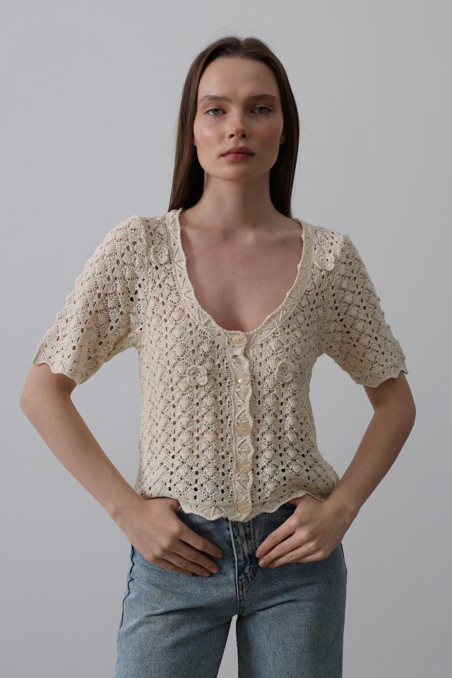 Çiçek Detaylı Düğmeli Triko – Ekru
