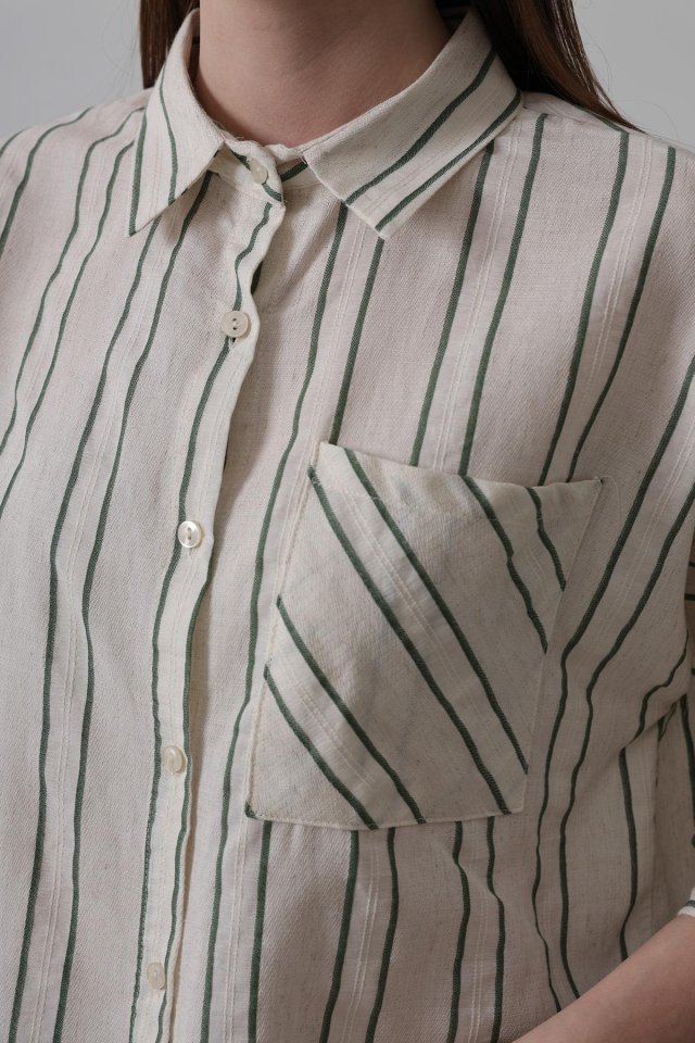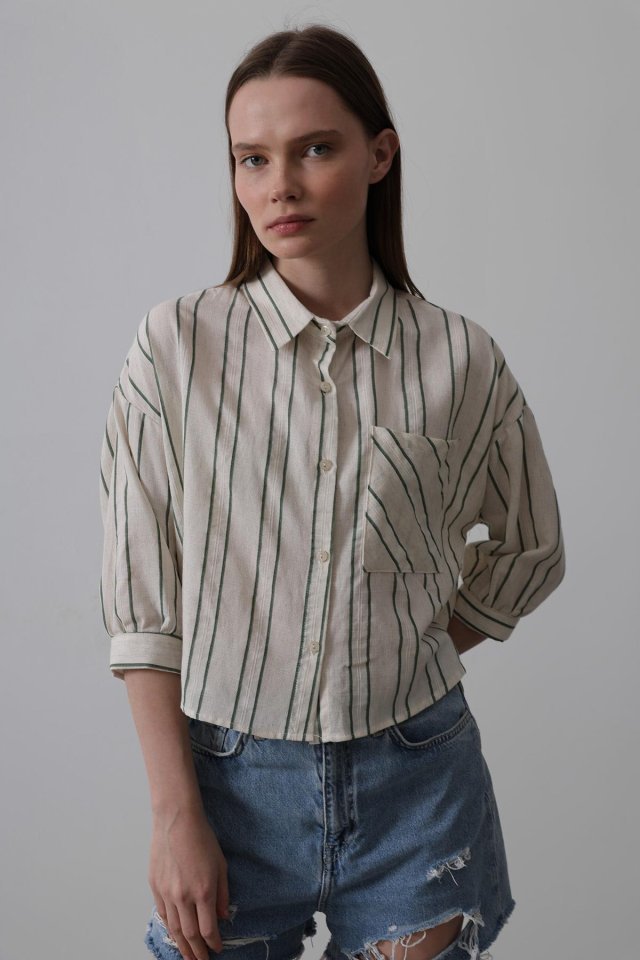Çizgili Kısa Gömlek – Bej-Yeşil