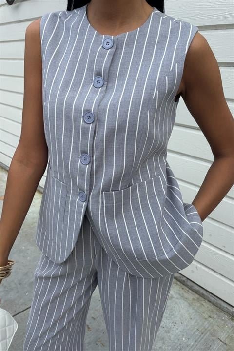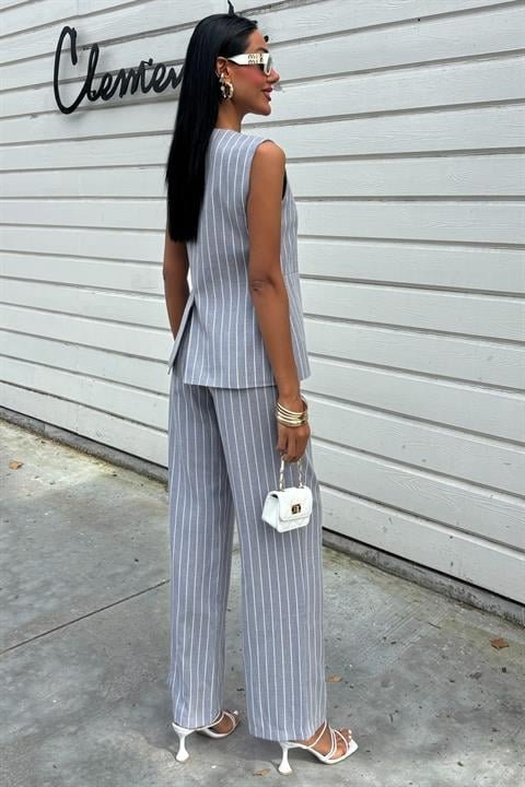 Çizgili Viscon Keten Yelekli Rahat Takım 10121