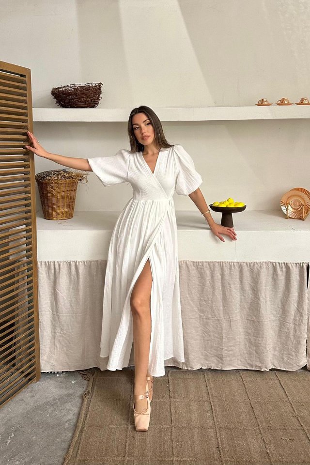 Ekru Müslin Uzun Elbise