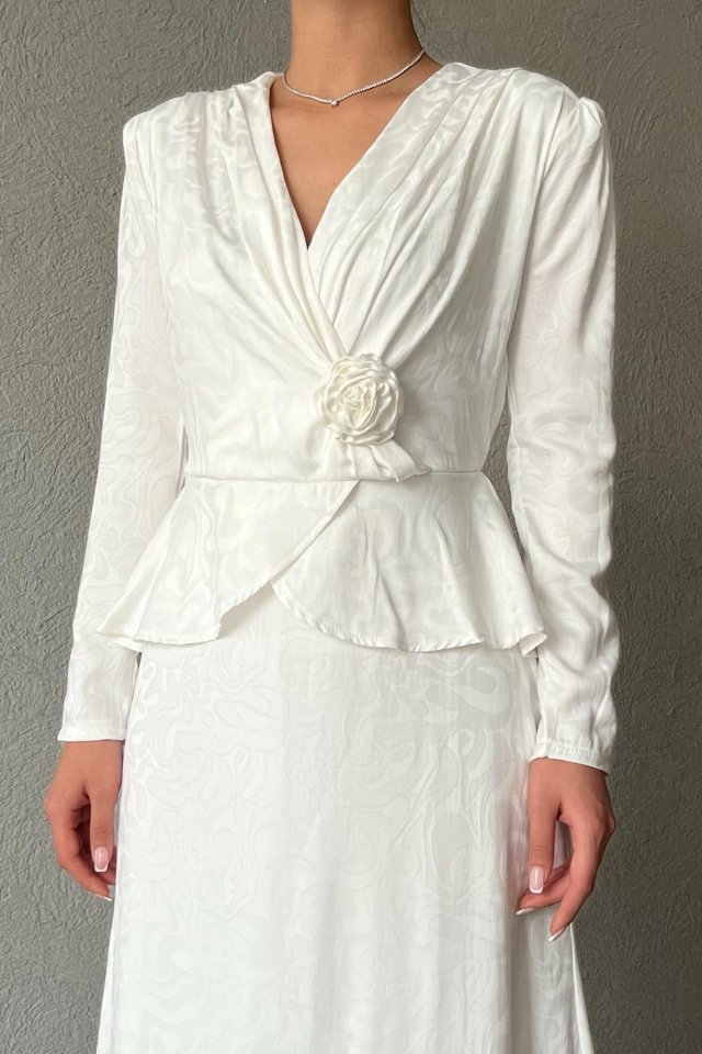 Ekru Pile Detaylı Kruvaze Elbise