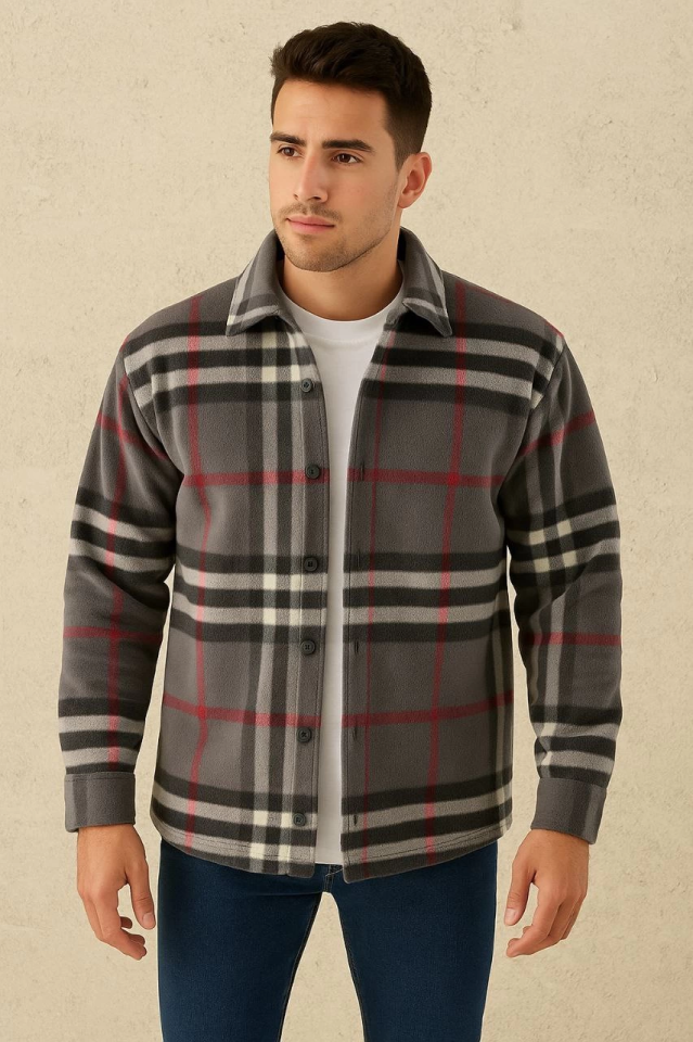 Erkek Ekose Desenli Düğmeli Polar Yakalı Uzun Kollu Gömlek Oversize Rahat Kalıp – Füme