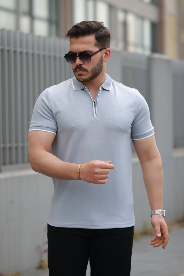 Erkek Fermuar Yakalı çizgi Detaylı Kısa Kollu Tişört