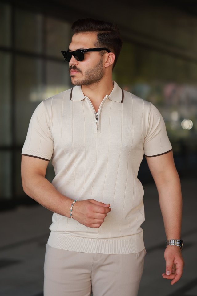 Erkek Fermuar Yakalı çizgi Dokulu Kısa Kollu Tişört