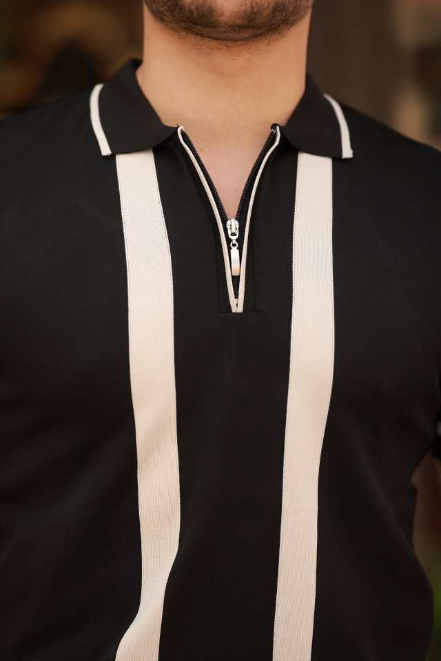 Erkek Fermuar Yakalı şerit Detaylı Kısa Kollu Tişört