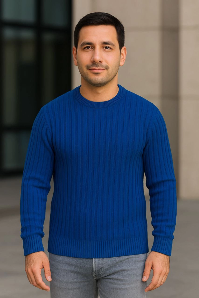 Erkek Fitilli Triko Kazak 2’li Set – Siyah – Saks Mavisi, Kalın Dokuma Pamuklu Regular Fit Bisiklet Yaka Uzun Kollu Rahat Kışlık Kazak Kombini