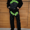 Erkek Kapüşonlu Eşofman Takım Örümcek Ağı Ve Neon Yeşil Baskılı Kanguru Cepli Oversize Rahat Kalıp, Premium Üç İplik Kumaş – Beyaz