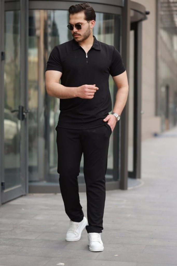 Erkek Kısa Kollu önden Fermuarlı Janjan Krep Tişört Ve Pantolon Ikili Takım