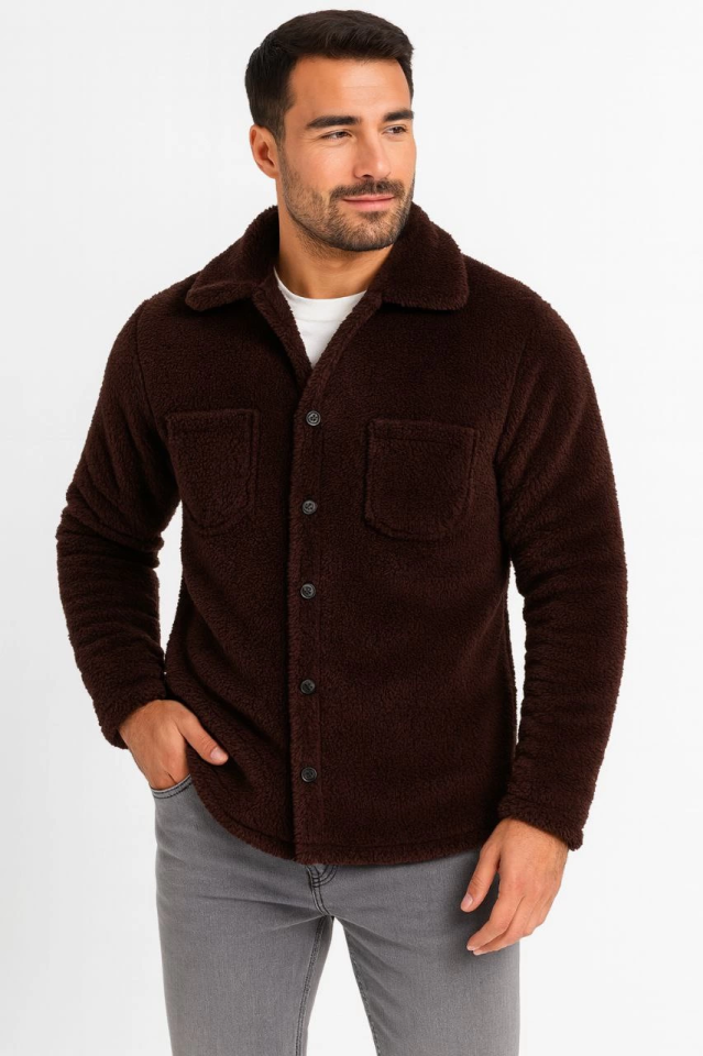 Erkek Pelüş Polar Hırka Gömlek – Yakalı, İlik Düğmeli, Göğüs Cepli, Yumuşak Dokulu Kışlık Regular Fit Rahat Günlük Model – Kahverengi