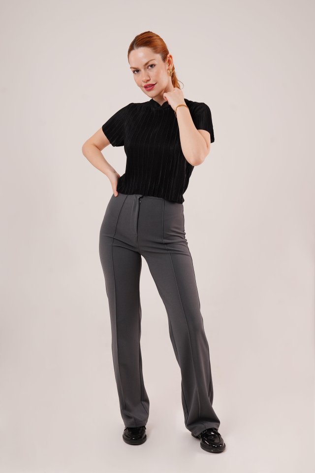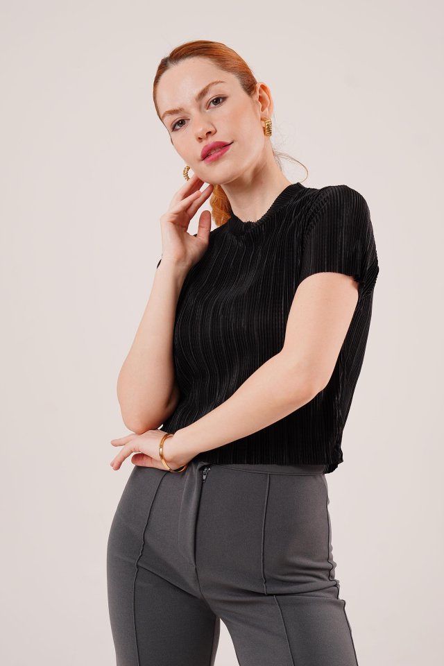Fitilli Kısa Kollu Parlak Siyah Bluz