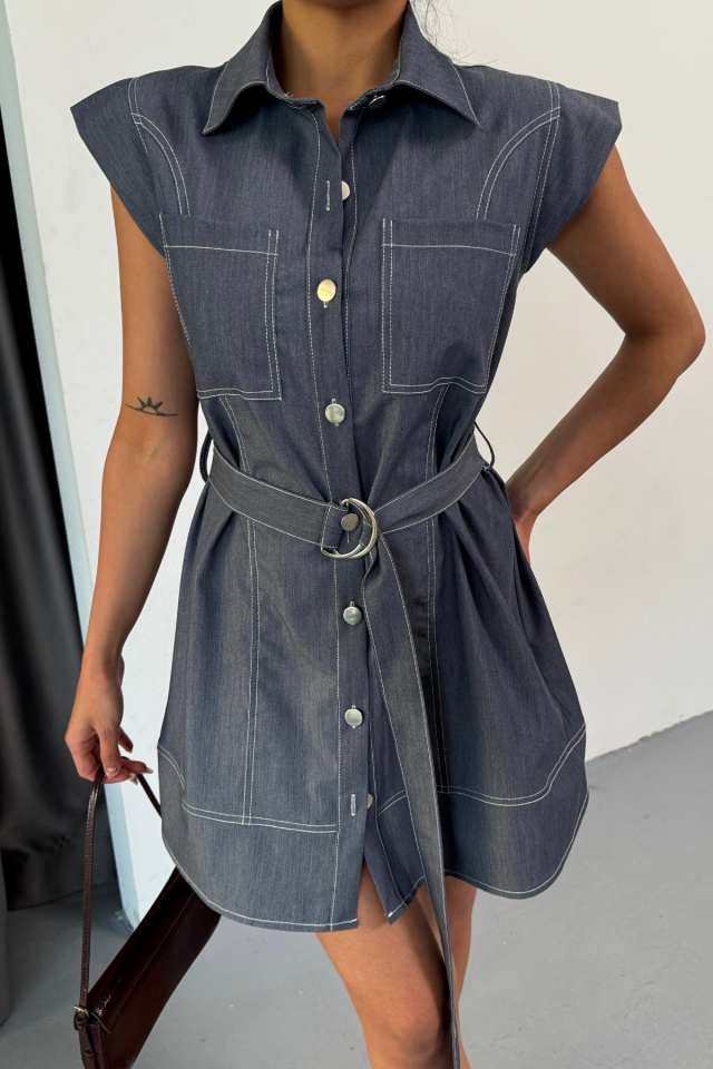 GÖMLEK ELBİSE KOLSUZ TENCEL KUMAŞ – Mavi