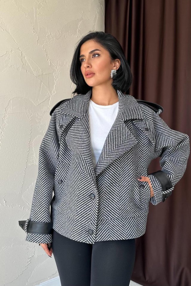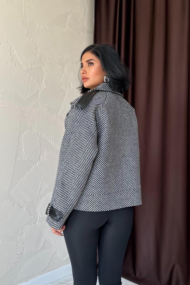 Gri Çizgili Deri Garnili Ceket