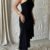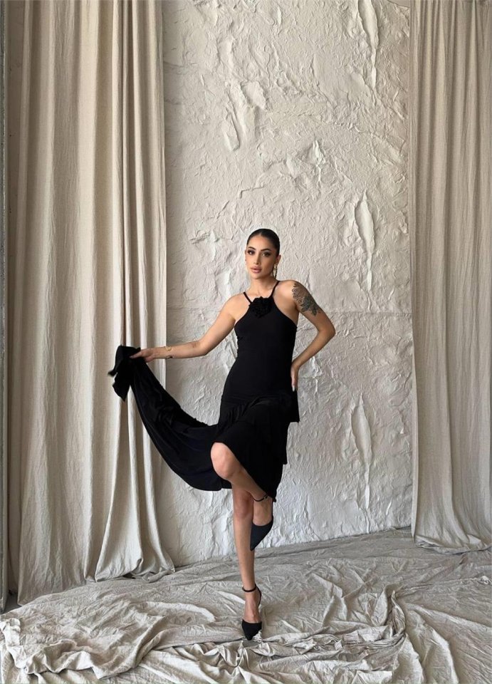 GÜLLÜ ELBİSE ASİMETRİK KATLI – Siyah