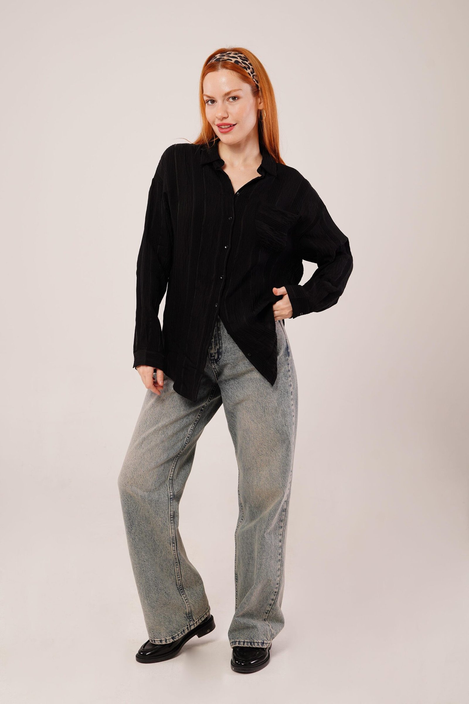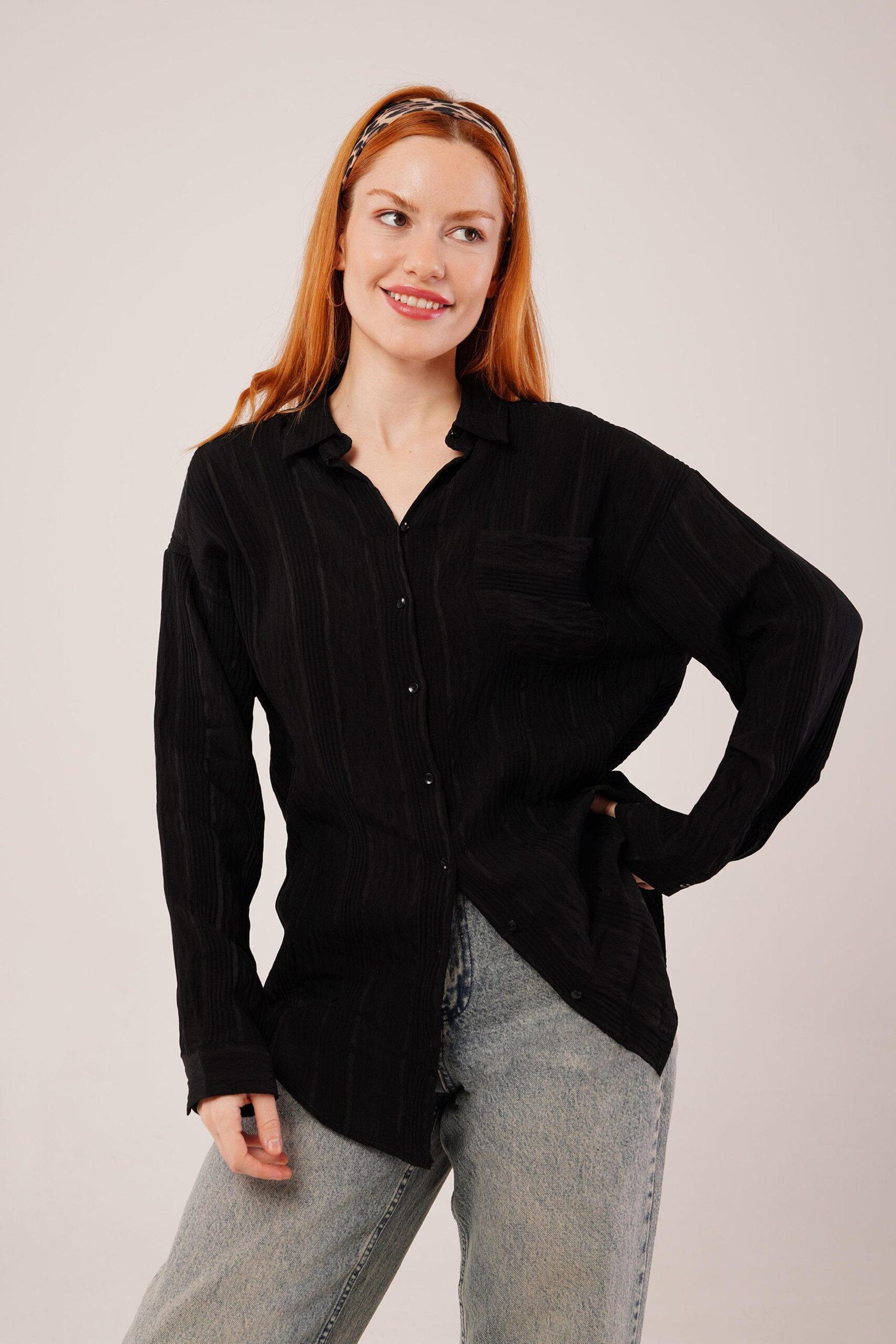 Hakim Yaka Çizgili Cep Detaylı Siyah Gömlek