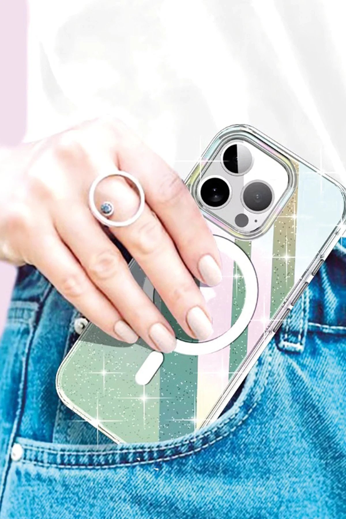 Rasasi Simli MagSafe Kapak, telefonunuzu korurken şıklığını artıran özel bir aksesuardır. Simli yüzeyi ve MagSafe uyumluluğu ile hem estetik hem de işlevsellik sunar