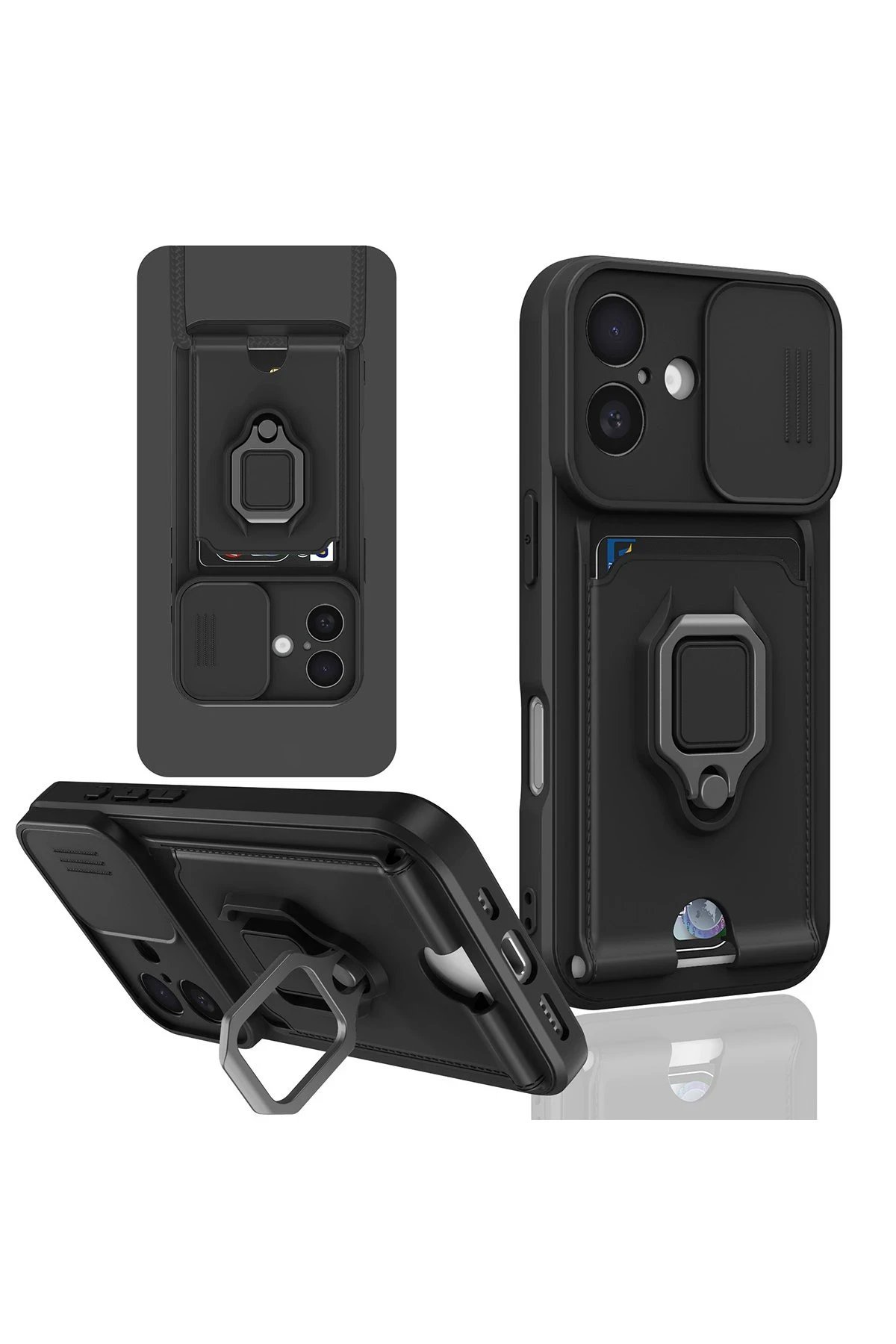 iPhone 16 Kılıf Zuma Kartvizitli Yüzüklü Silikon – Siyah-(5796)