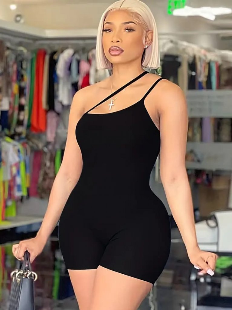 Kadın Asimetrik Askılı Mini Kaşkorse Bodycon Tulum