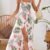Kadın Askılı önden Düğmeli Yaprak Desenli Uzun Süprem Elbise
