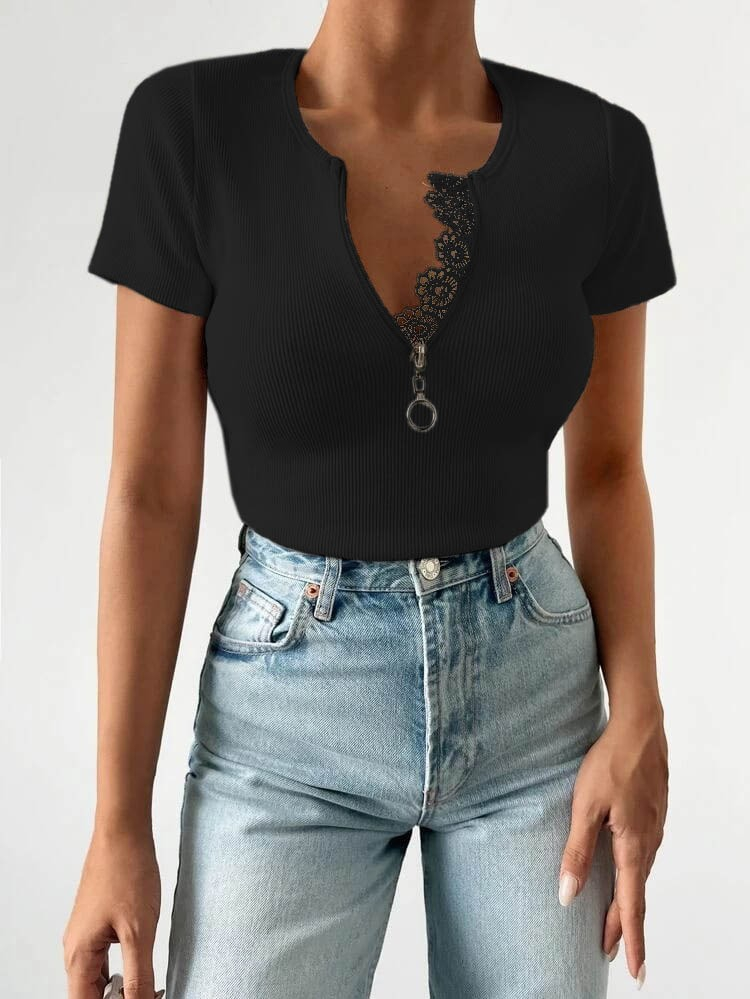 Kadın Beyaz Yaka Dantel Ve Fermuarlı Kaşkorse Bluz
