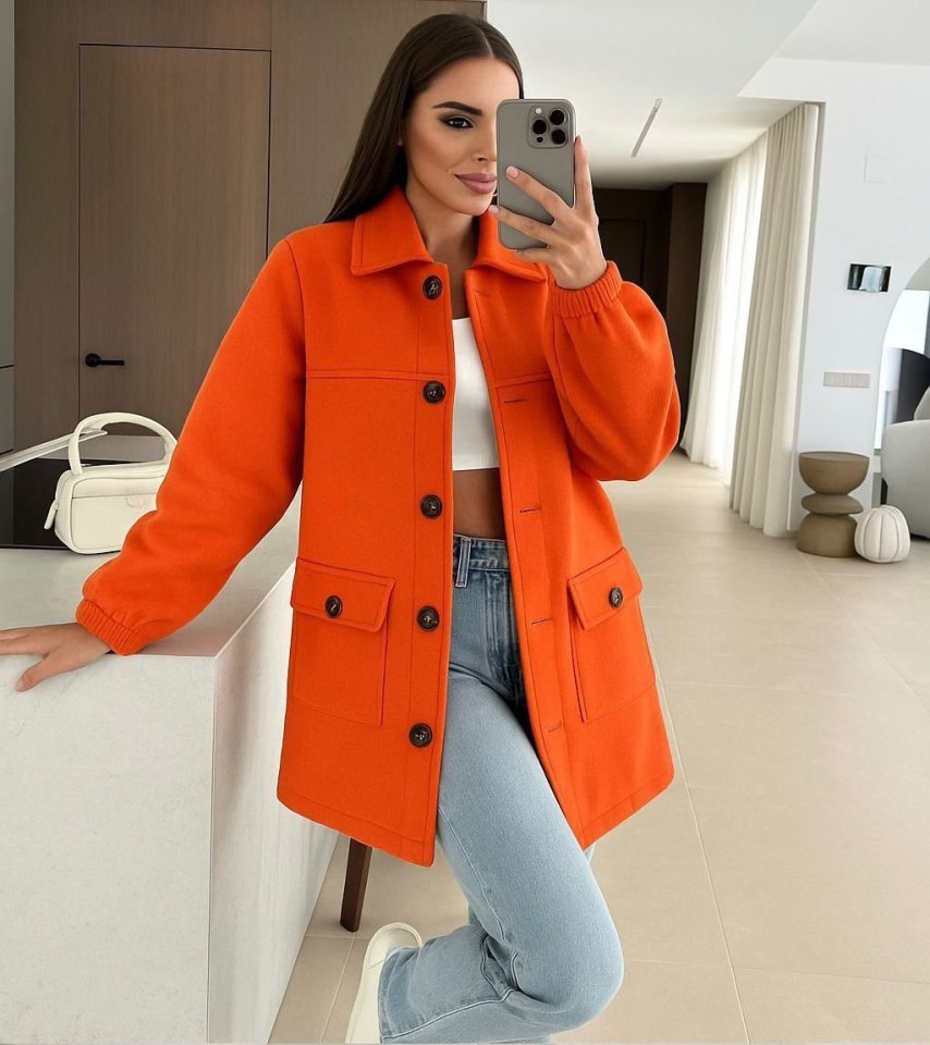 Kadın Bileği Lastikli Cep Ve Leopar Düğme Detay Kaşe Kaban