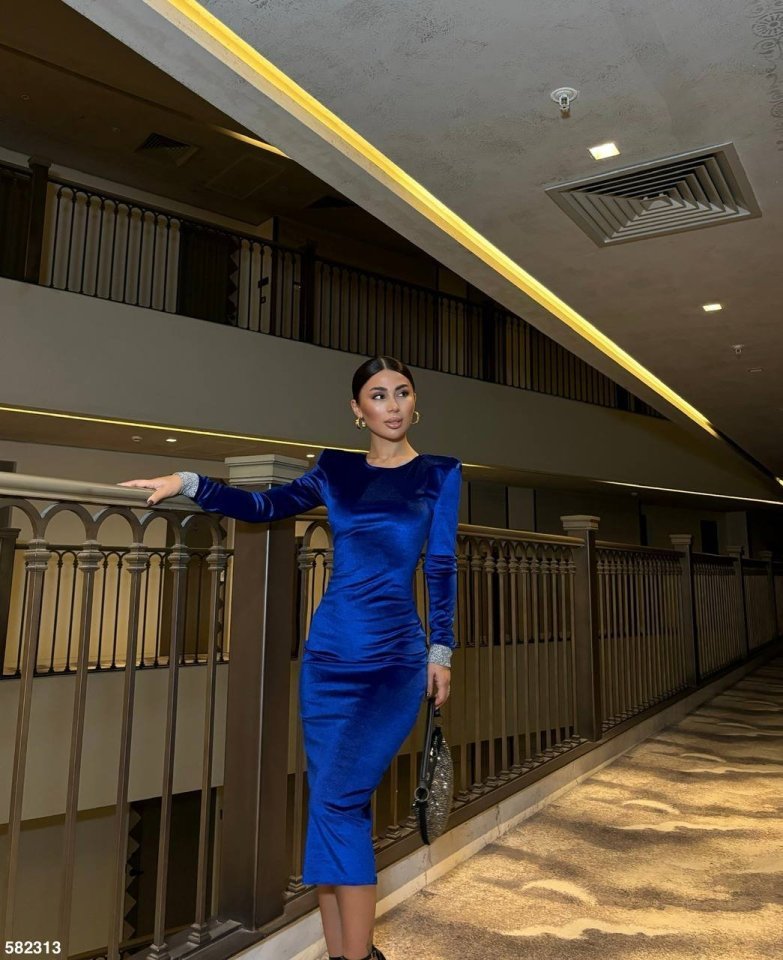 Kadın Bisiklet Yaka Vatkalı Manşet Detay Kadife Kumaş Midi Boy Elbise