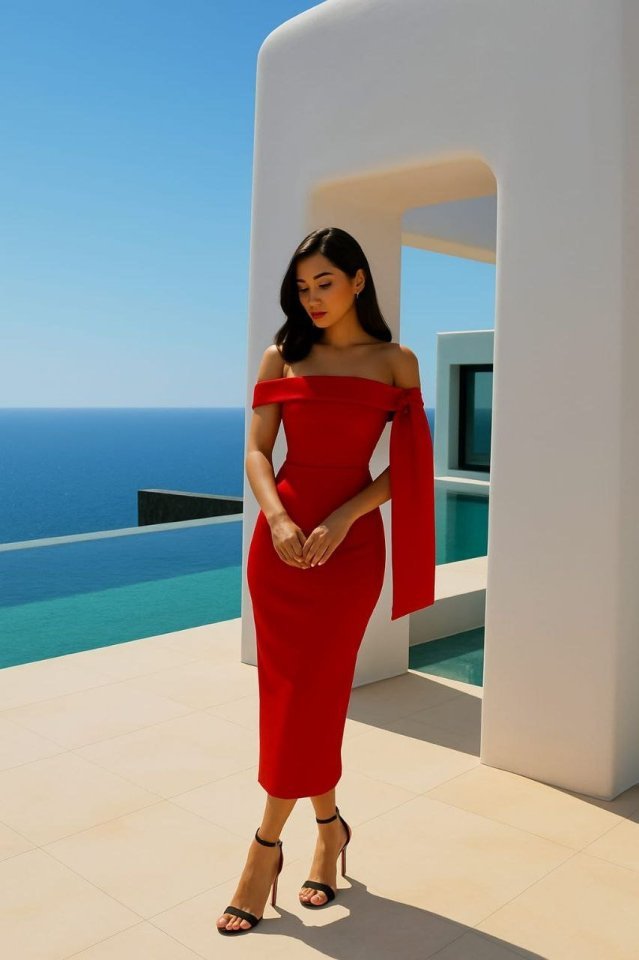 Kadın Dalgıç Krep Kumaş Madonna Yaka Midi Boy Elbise