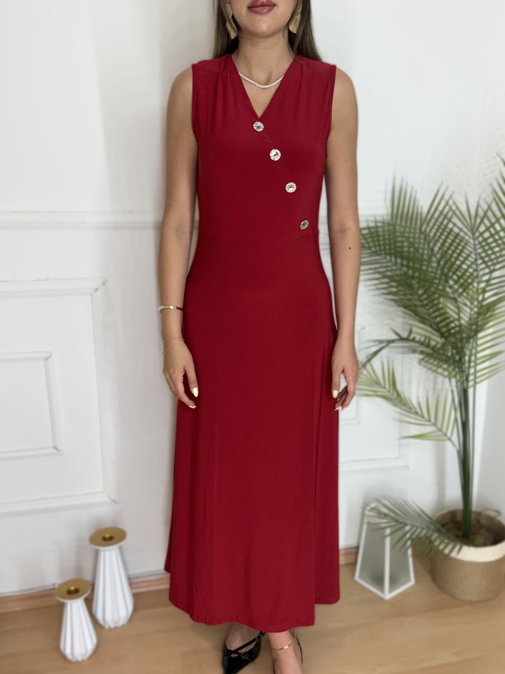 Kadın Düğme Detay Kolsuz Maxi Boy Elbise