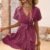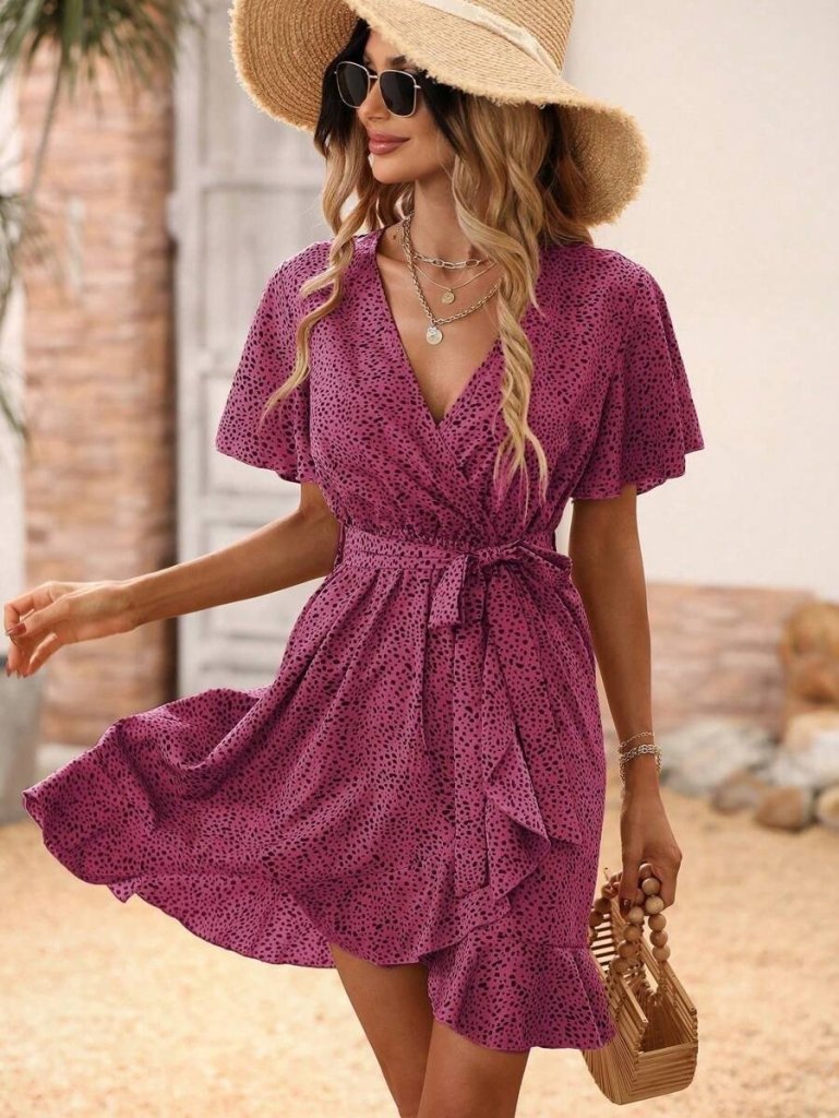Kadın Kısa Kelebek Kollu Kruvaze Yakalı Belden Kuşaklı Kısa Desenli Süprem Elbise