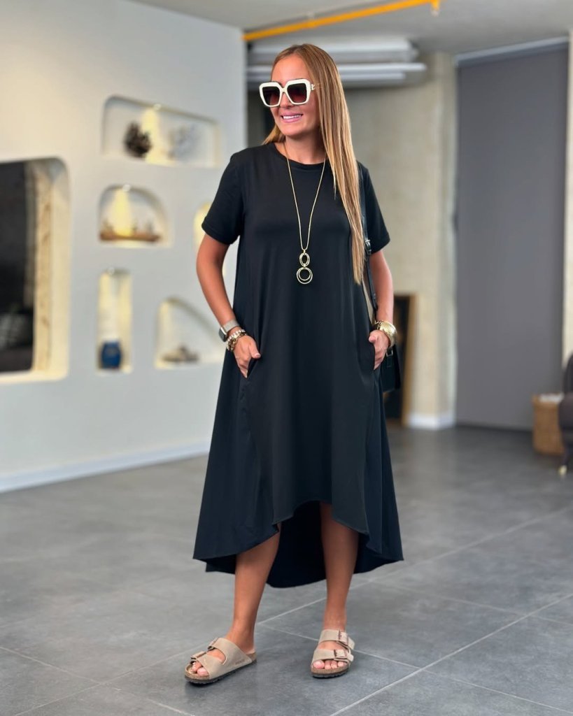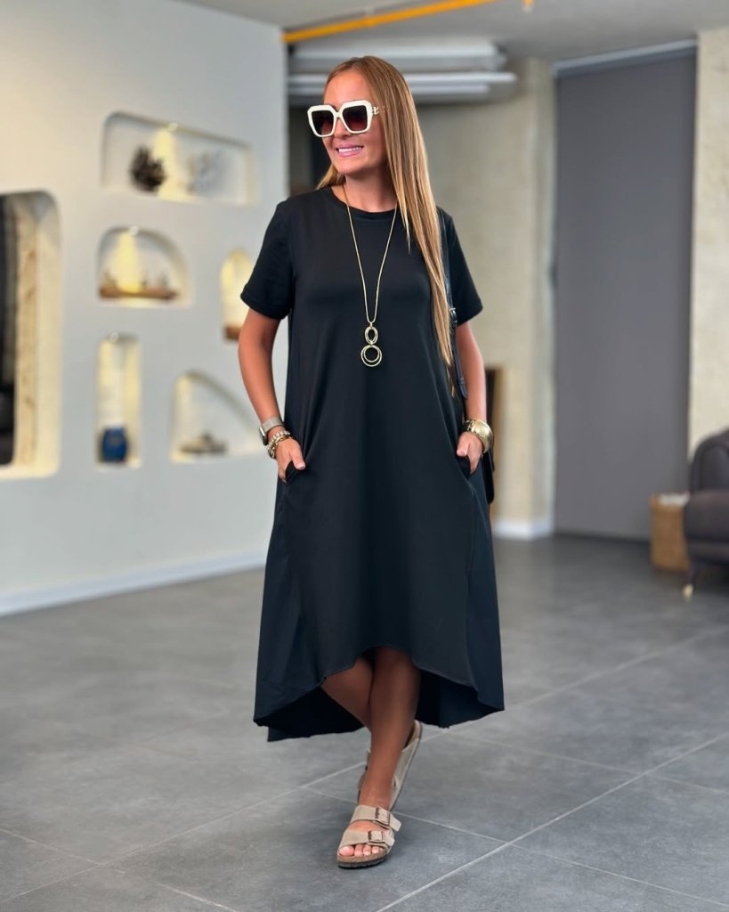 Kadın Kısa Kollu Bisiklet Yaka Asimetrik Kesim ön Viskon Arkası Trikoton Elbise