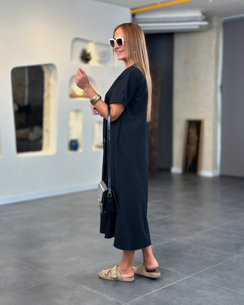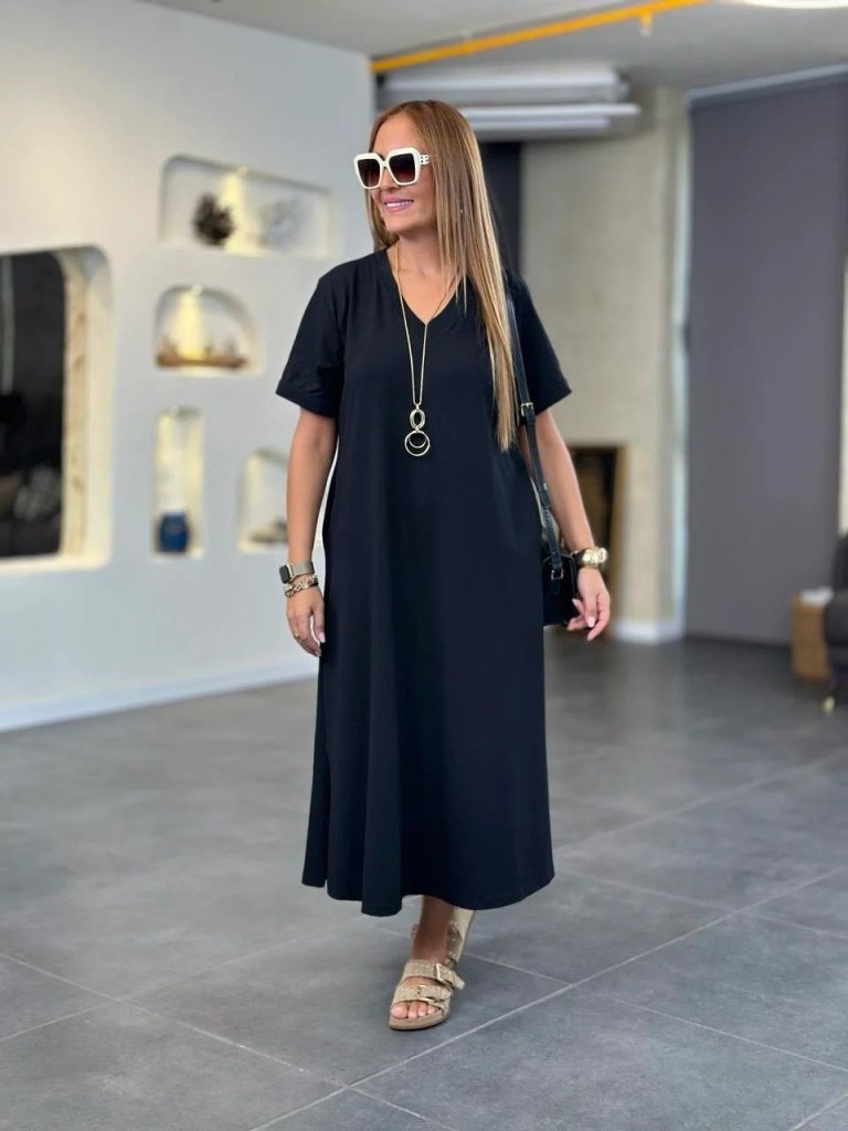 Kadın Kısa Kollu V Yakalı Cep Detaylı Uzun Viskon Iki Iplik Elbise