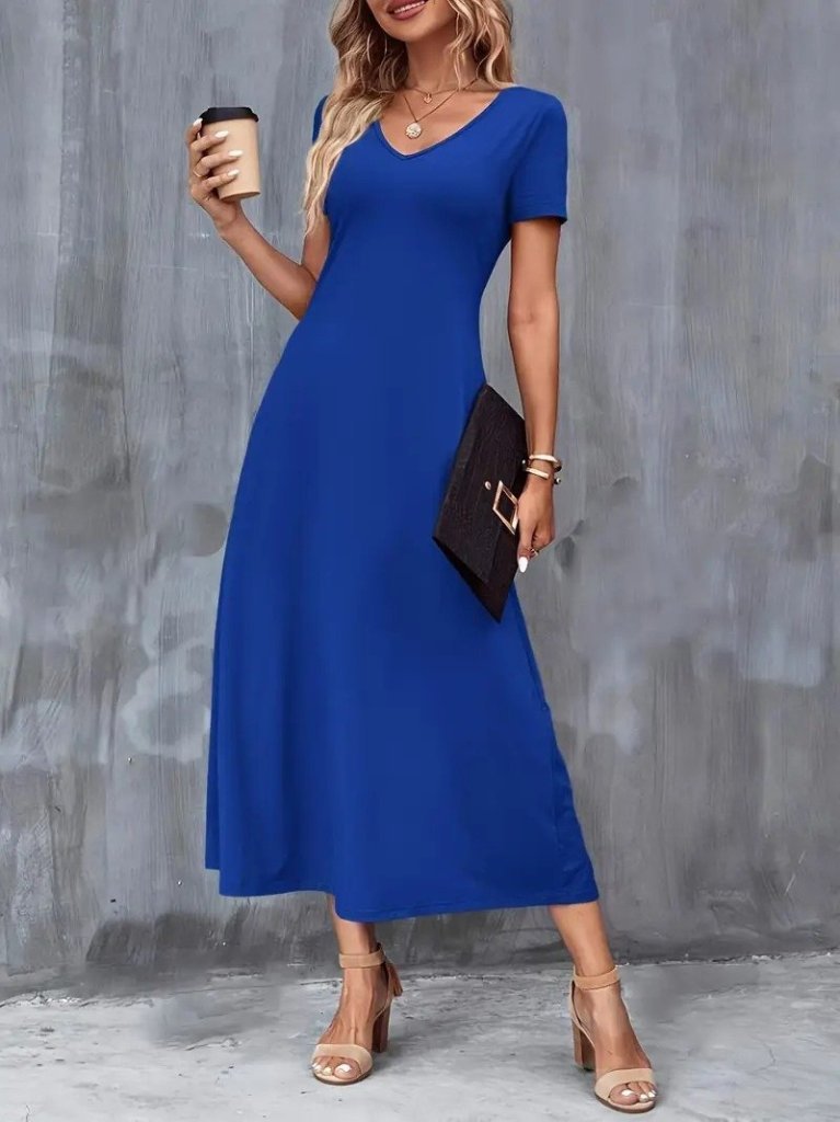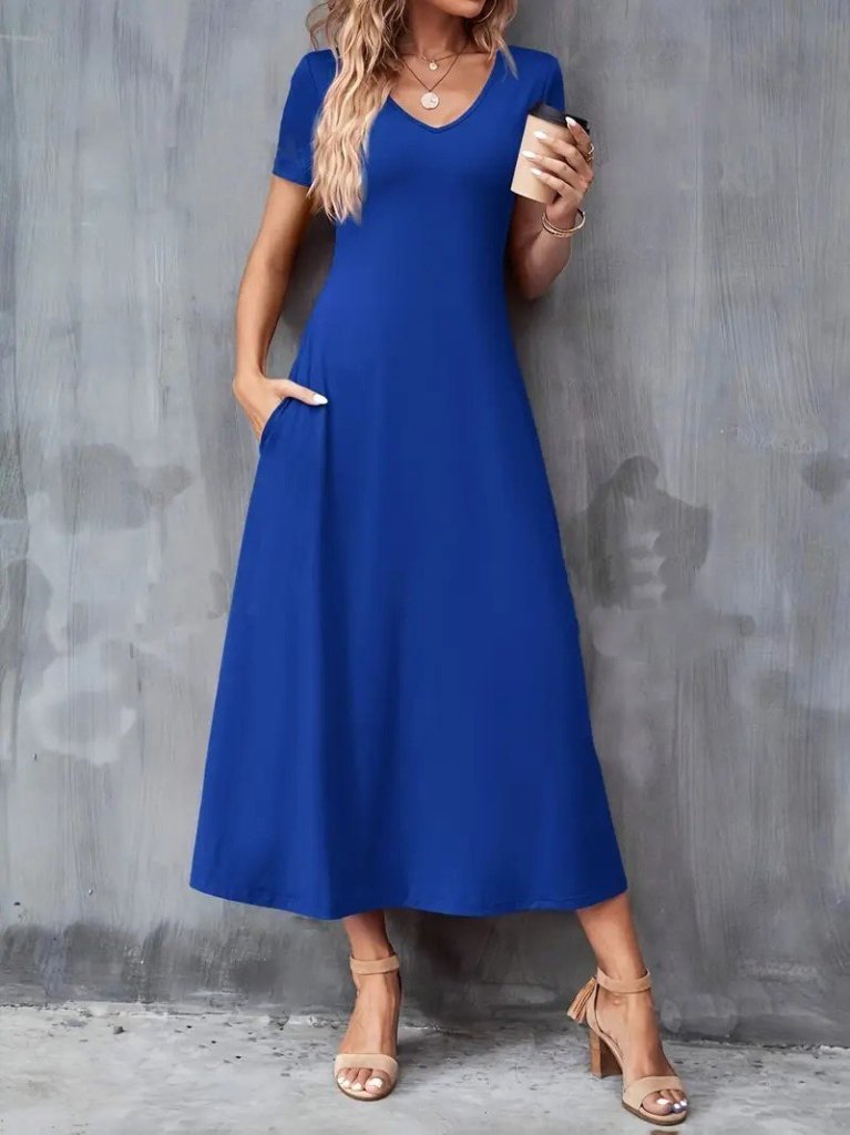 Kadın Kısa Kollu V Yakalı Cepli Viskon Elbise