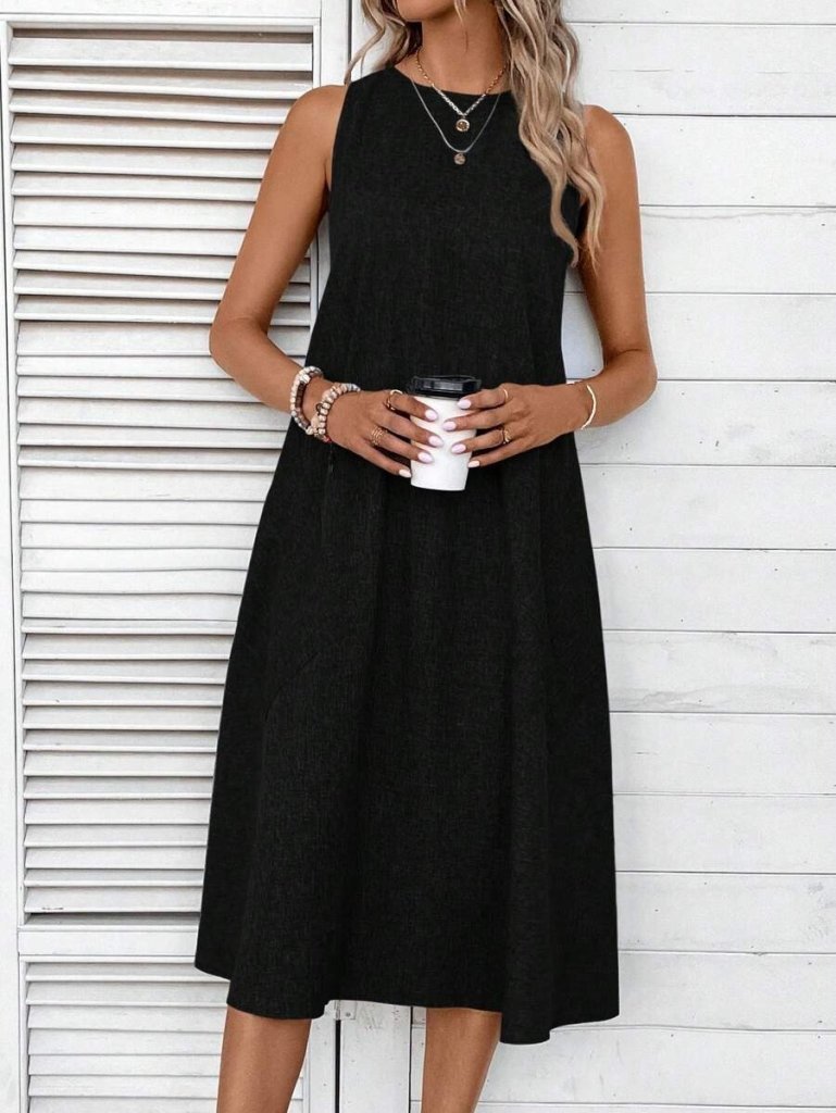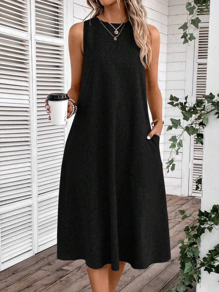 Kadın Kolsuz Bisiklet Yaka Cepli Midi Keten Elbise