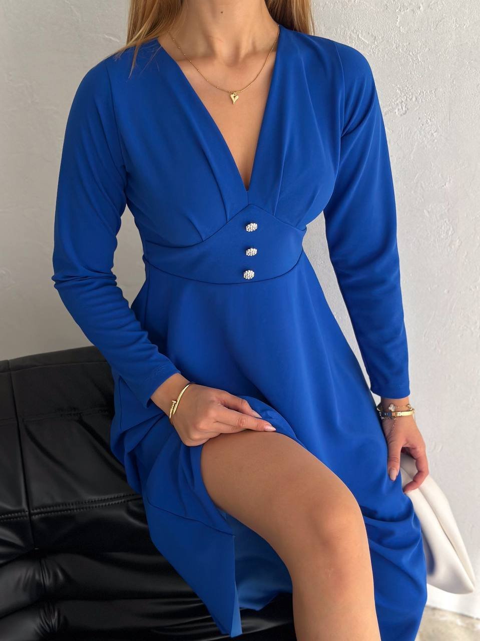 Kadın Krep Kumaş Düğme Detaylı V Yaka Uzun Kollu Midi Boy Elbise