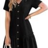 Kadın Omuzlardan Açık V Yakalı Kısa Kollu Yanlardan Büzgülü Düğme Detaylı Janjan Krep Elbise