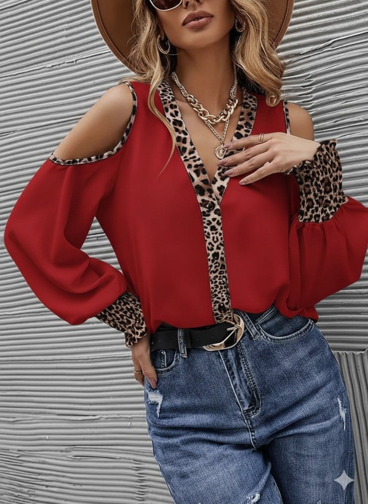 Kadın Omuzlardan Açık Yakalı önden Düğmeli Leopar Detaylı Sandy Bluz
