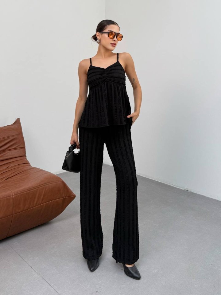 Kadın Siyah Dokulu Askılı Üst Ve Bol Paça Pantolon 2’li Takım